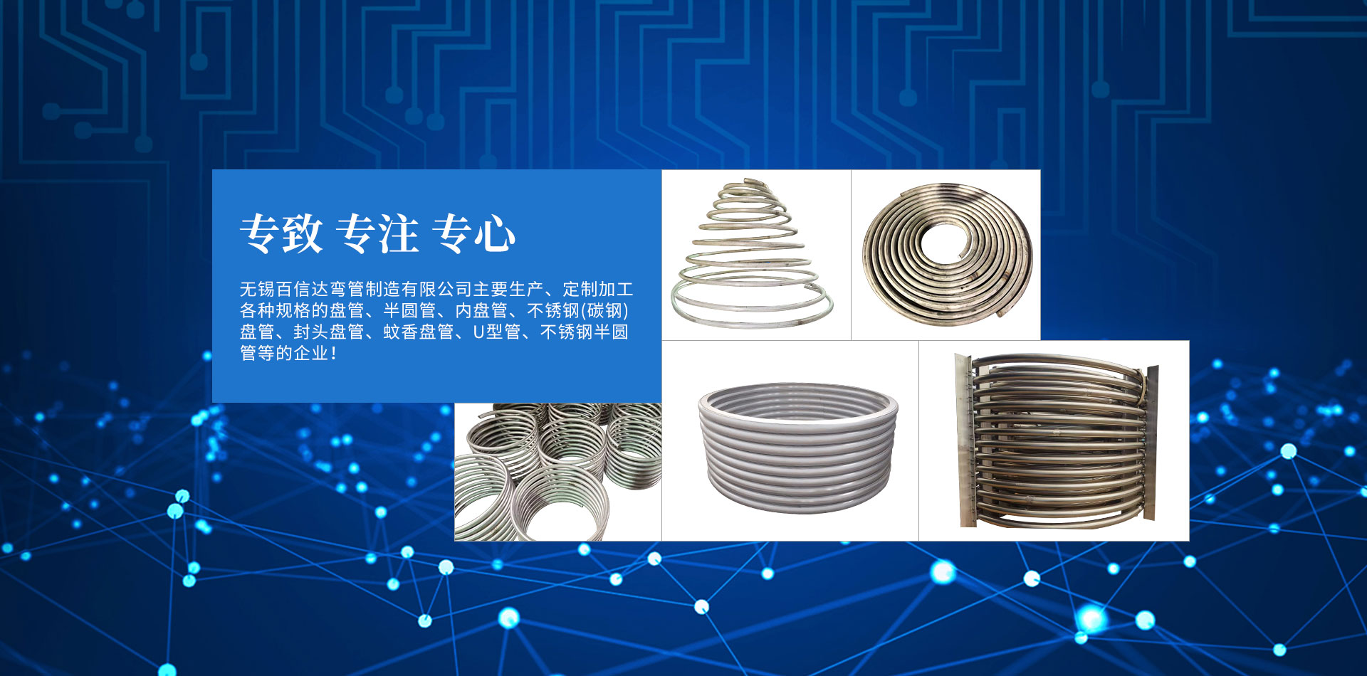 無錫百信達彎管制造有限公司位于經(jīng)濟發(fā)達、風(fēng)景秀麗的太湖之濱。本公司擁有完整、科學(xué)的質(zhì)量管理體系,公司的誠信、實力和產(chǎn)品質(zhì)量獲得業(yè)界的認可。公司專注生產(chǎn)、定制加工各種規(guī)格的盤管、半圓管、內(nèi)盤管、不銹鋼盤管、封頭盤管、蚊香盤管、U型管、不銹鋼半圓管、碳鋼盤管等的企業(yè)。本公司設(shè)計加工的彎管設(shè)備,質(zhì)量精良、結(jié)構(gòu)合理,效率高、操作簡易、經(jīng)久耐用。公司已經(jīng)承接了各地多個大型場館工程項目的彎管加工,屢次得到了多家大客戶的好評。努力滿足客戶的需要,不斷提高自身水平是公司追求的目標。歡迎社會各界朋友蒞臨無錫百信達彎管制造有限公司參觀、指導(dǎo)和業(yè)務(wù)洽談!